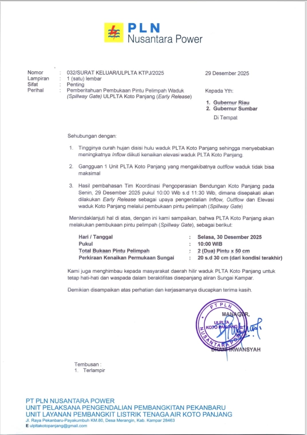 Antisipasi Lonjakan Air, PLN Buka Dua Pintu Spillway Waduk Koto Panjang Mulai.