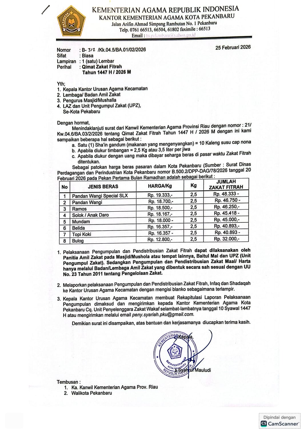 Zakat Fitrah 2026 di Pekanbaru Resmi Diumumkan, Mulai Rp32 Ribu hingga Rp48.