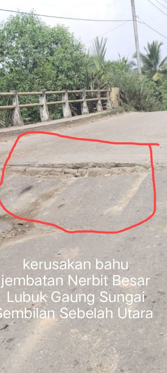 Kerusakan Bahu Jembatan Nerbit Besar Kelurahan Lubuk Gaung Kecamatan Sungai Sembilan dibiarkan menyebabkan jatuh korban baru baru.